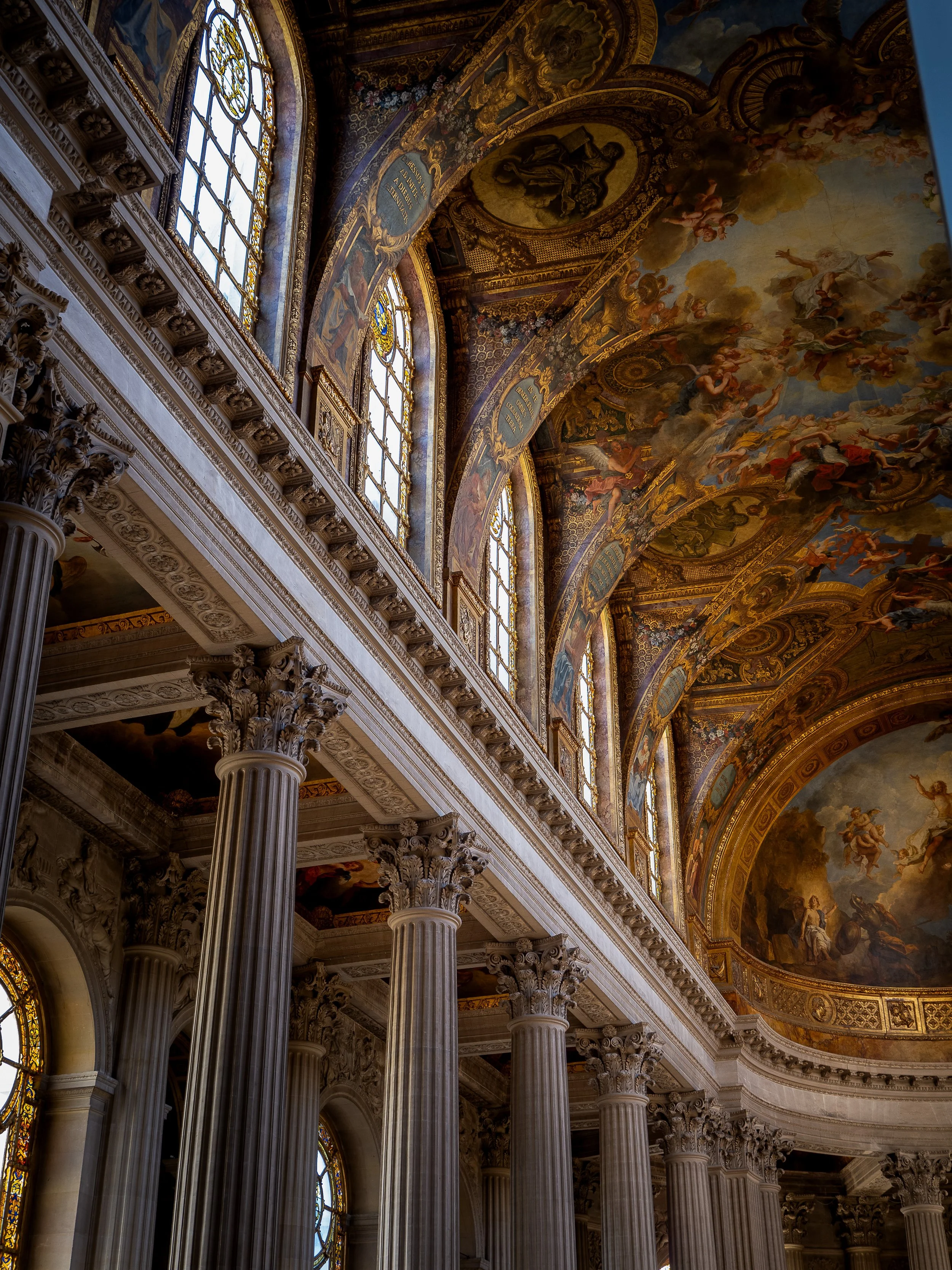 Intérieur d'une église ou chapelle avec des colonnes corinthiennes imposantes et un plafond richement décoré de fresques et peintures. Les fenêtres sont ornées de vitraux colorés.