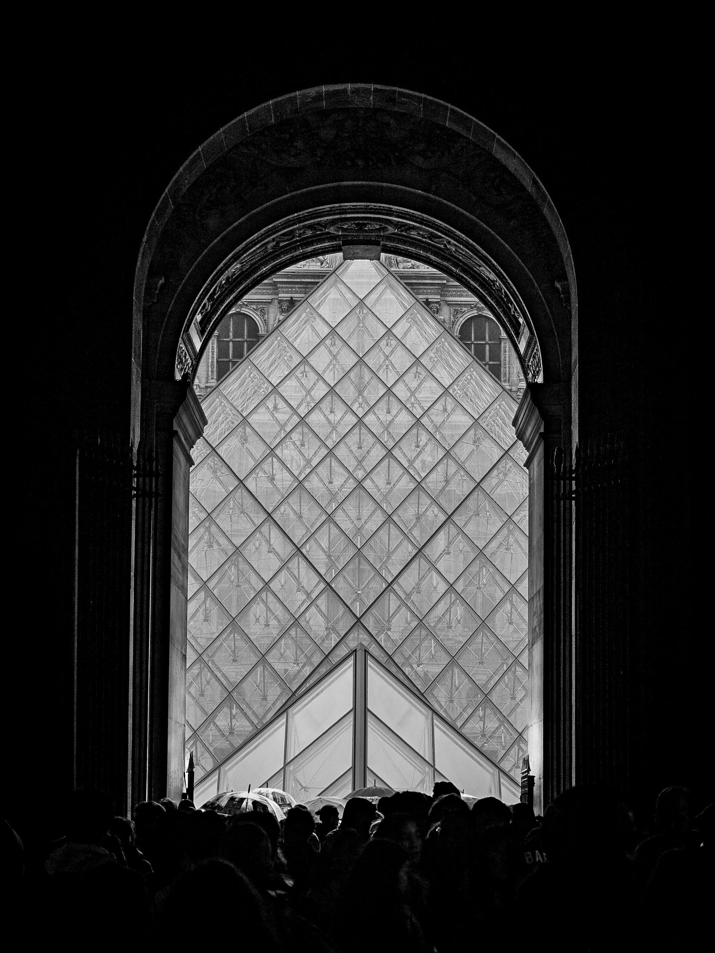 Vue de la pyramide du Louvre à Paris à travers une arche, en noir et blanc.